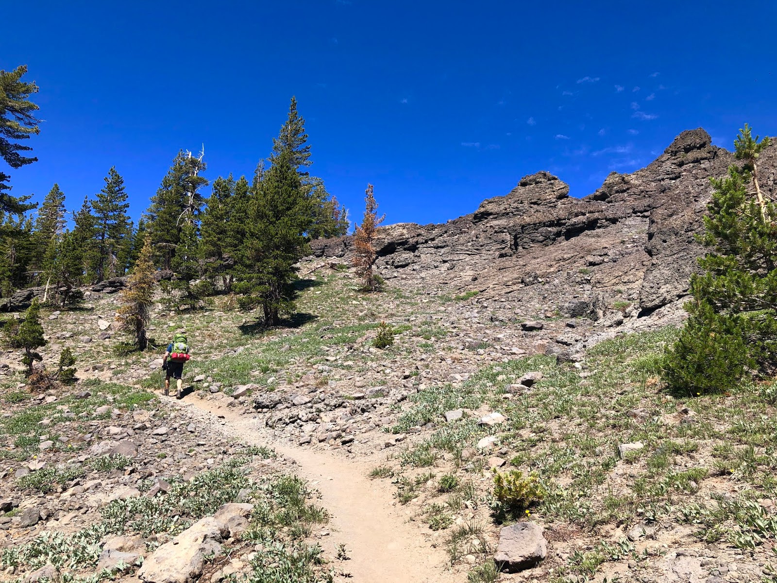 Time to get off the peak and toward the tree-line to get some shade and wind relief for lunch.